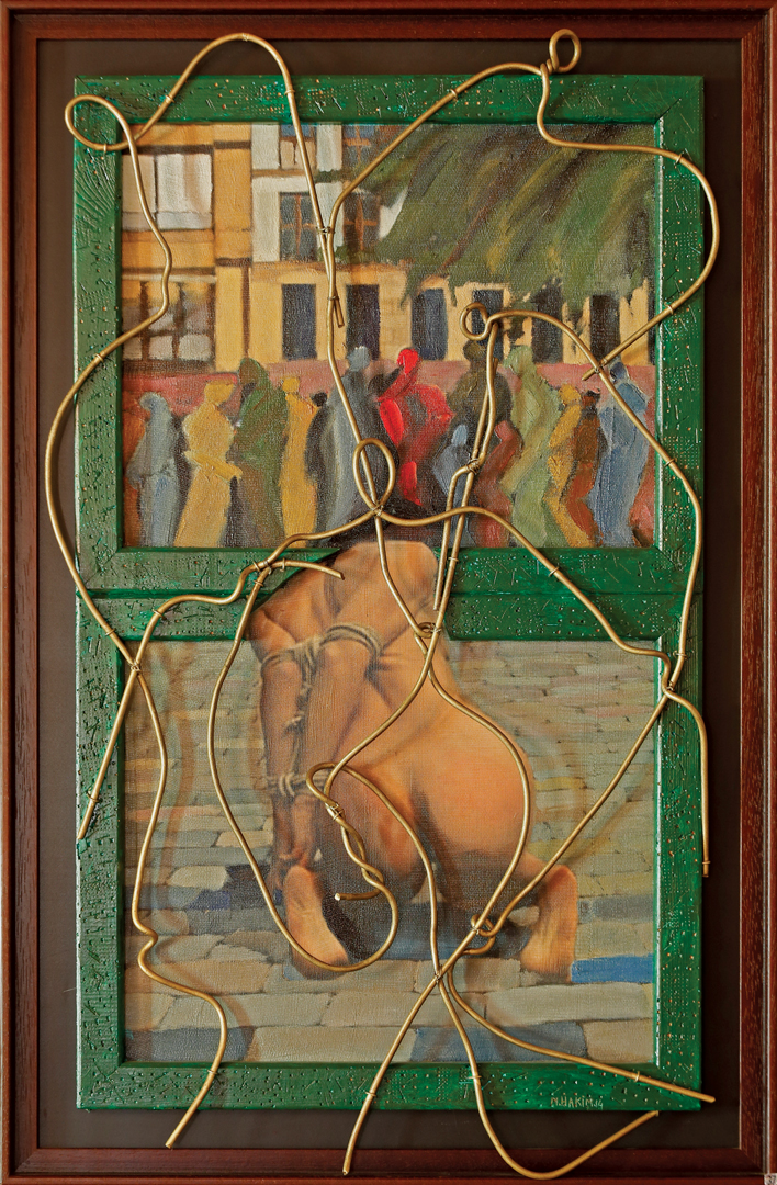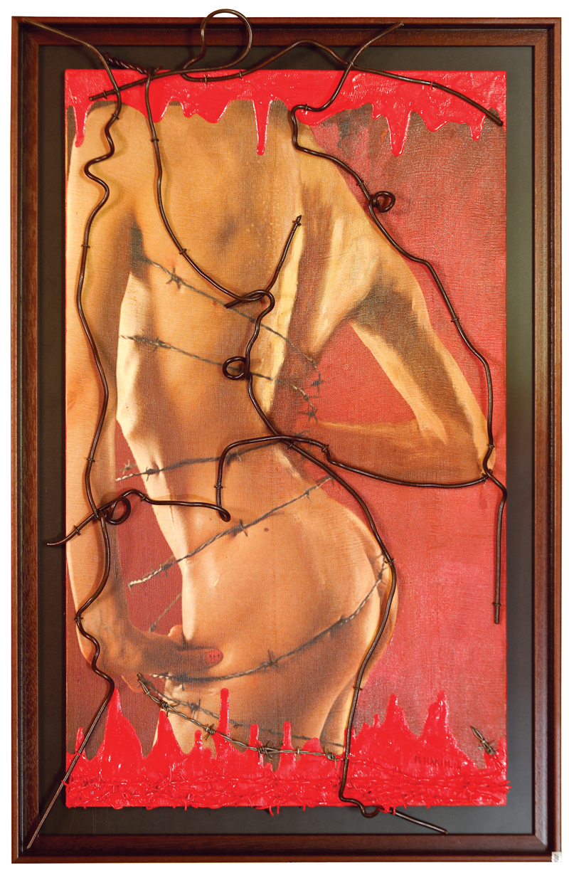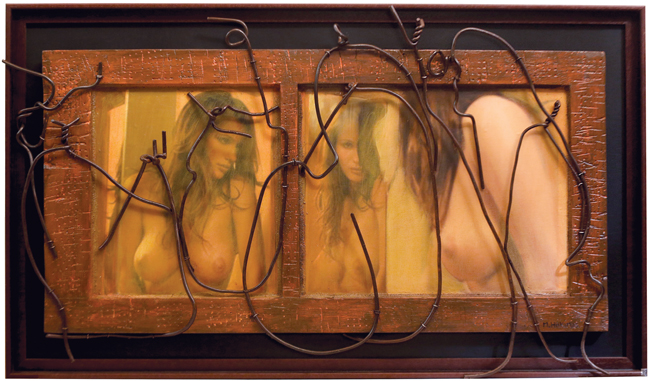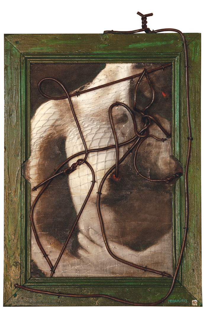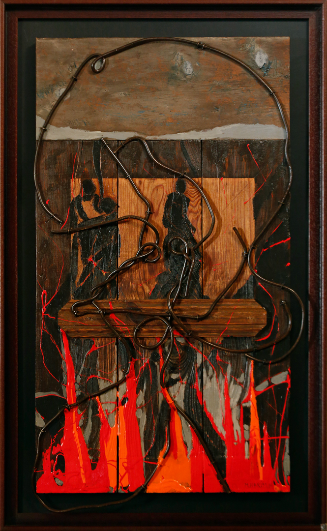 Acrylic, oil and barbed wire on wood