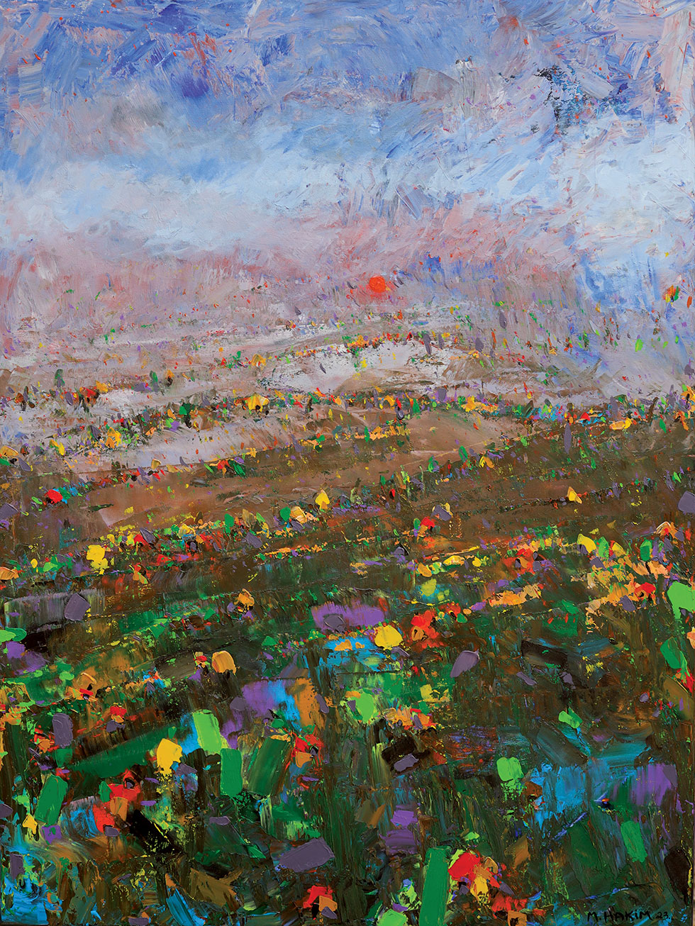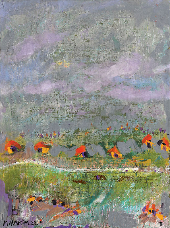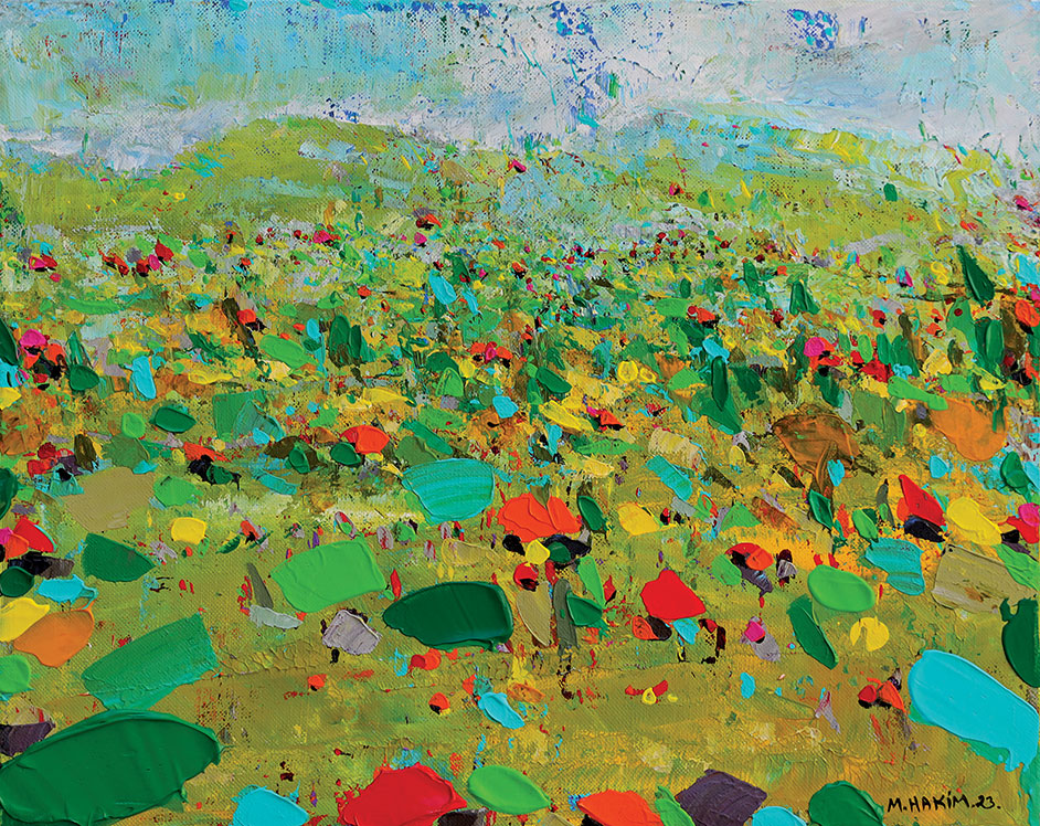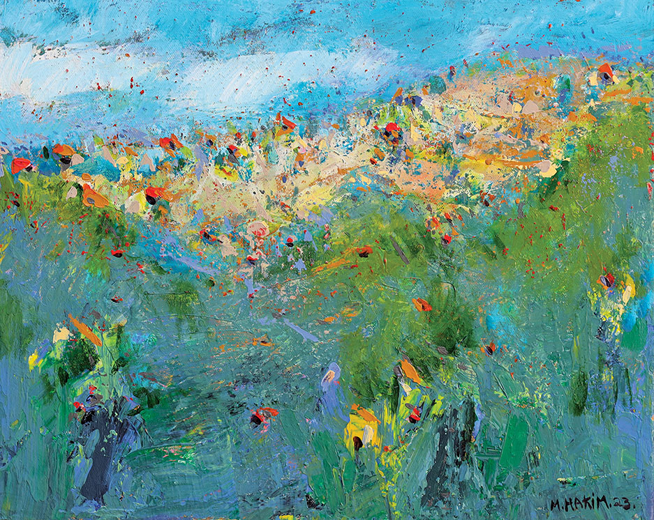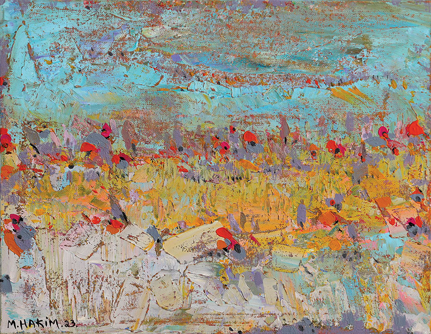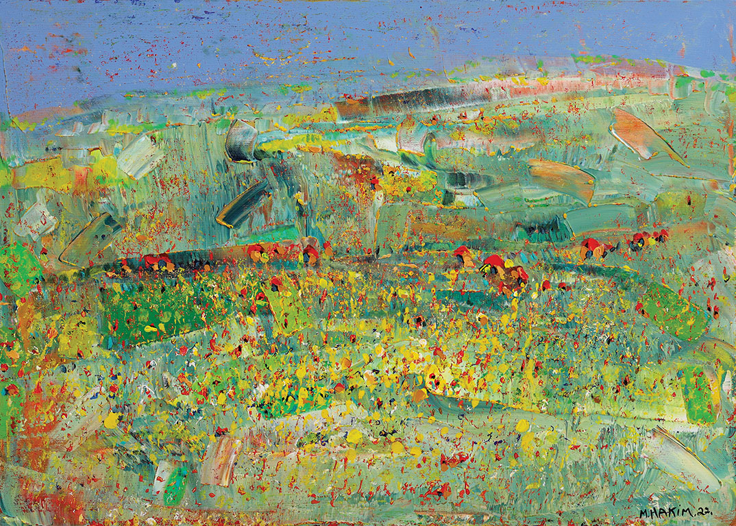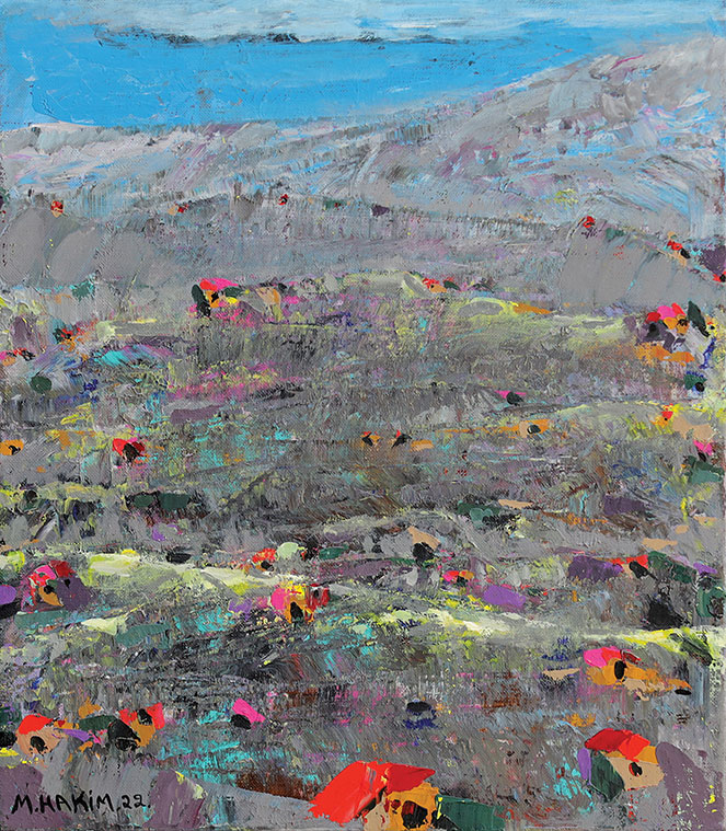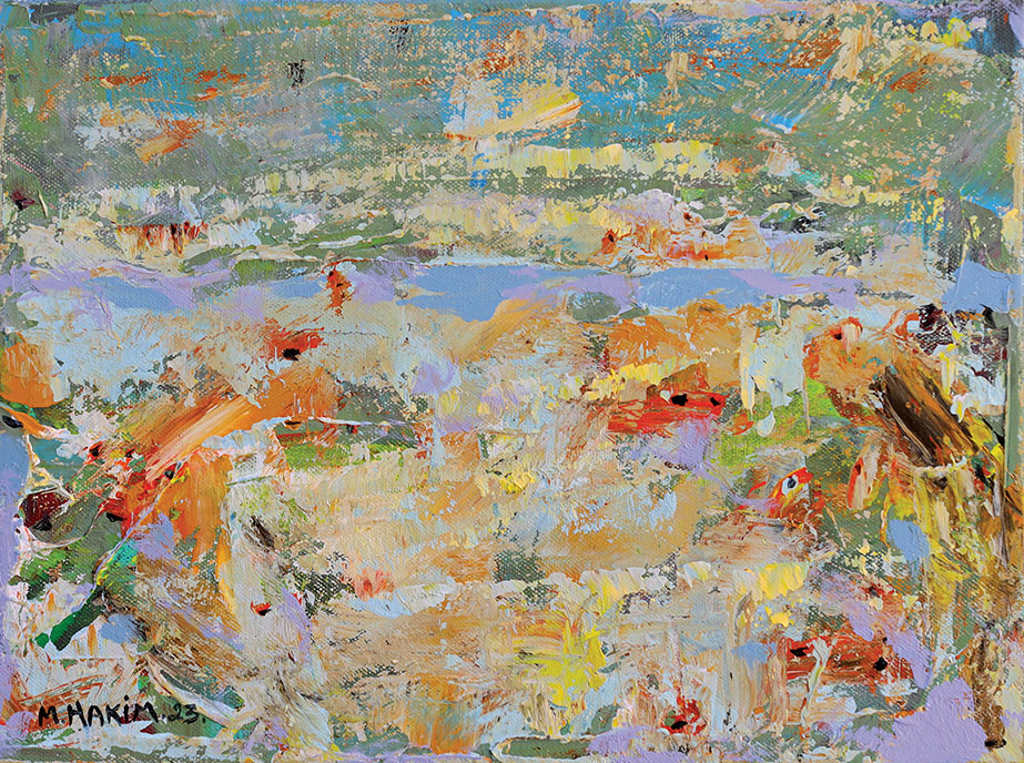 Maroun Hakim writes in introducing his new exhibition: “Luminous is the face of the earth, in its vibrations, its fertility and its interactions with light, water and soil. This dense identification with the beauties of nature does not prevent the interventions of my interior with current external events, and the anxious premonitions from which darkness and sadness emanate.”