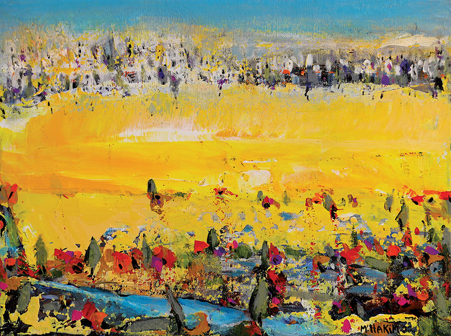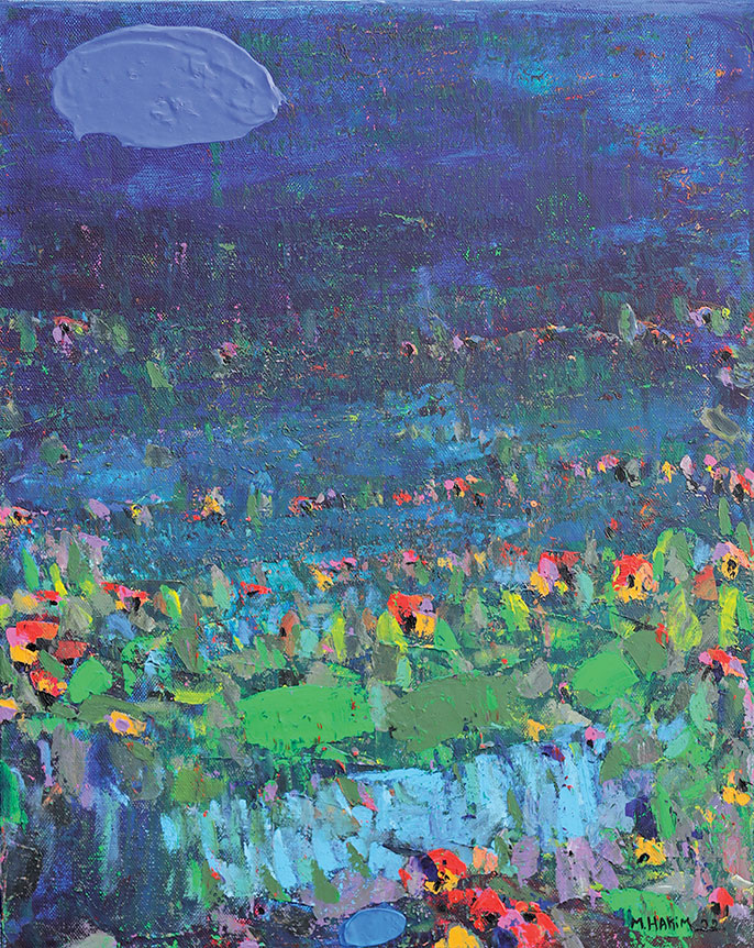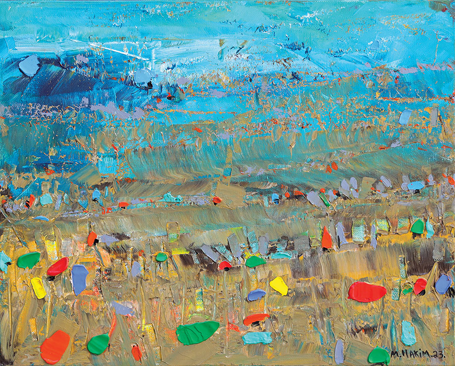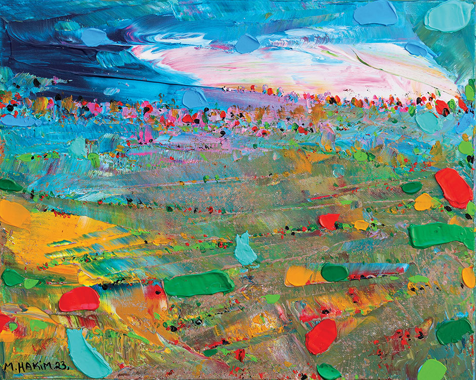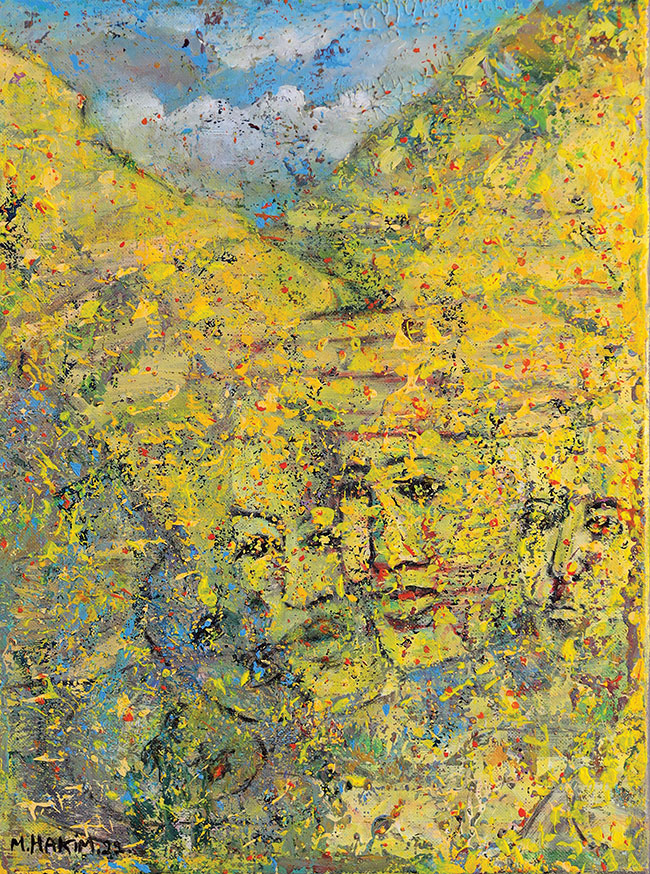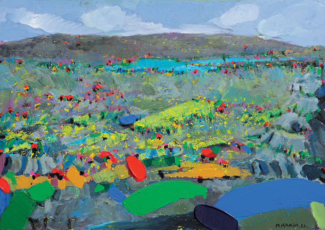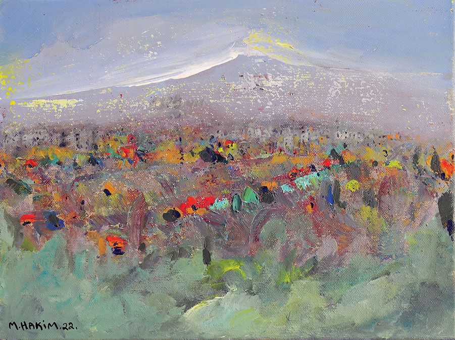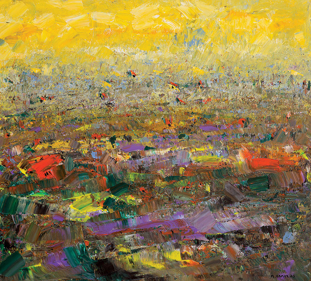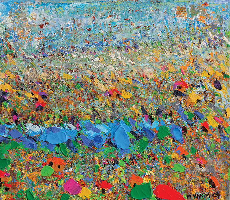 Maroun Hakim writes in introducing his new exhibition: “Luminous is the face of the earth, in its vibrations, its fertility and its interactions with light, water and soil. This dense identification with the beauties of nature does not prevent the interventions of my interior with current external events, and the anxious premonitions from which darkness and sadness emanate.”