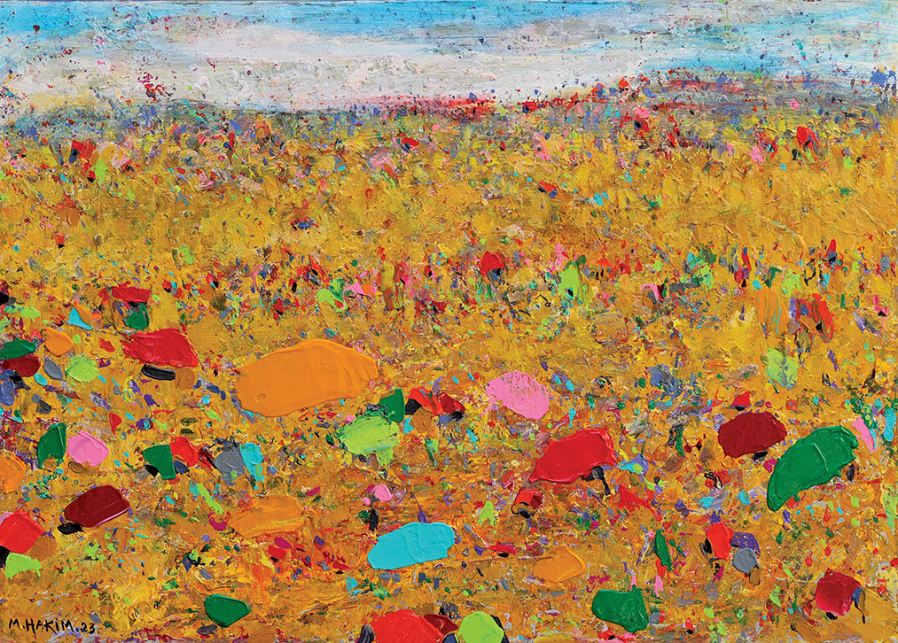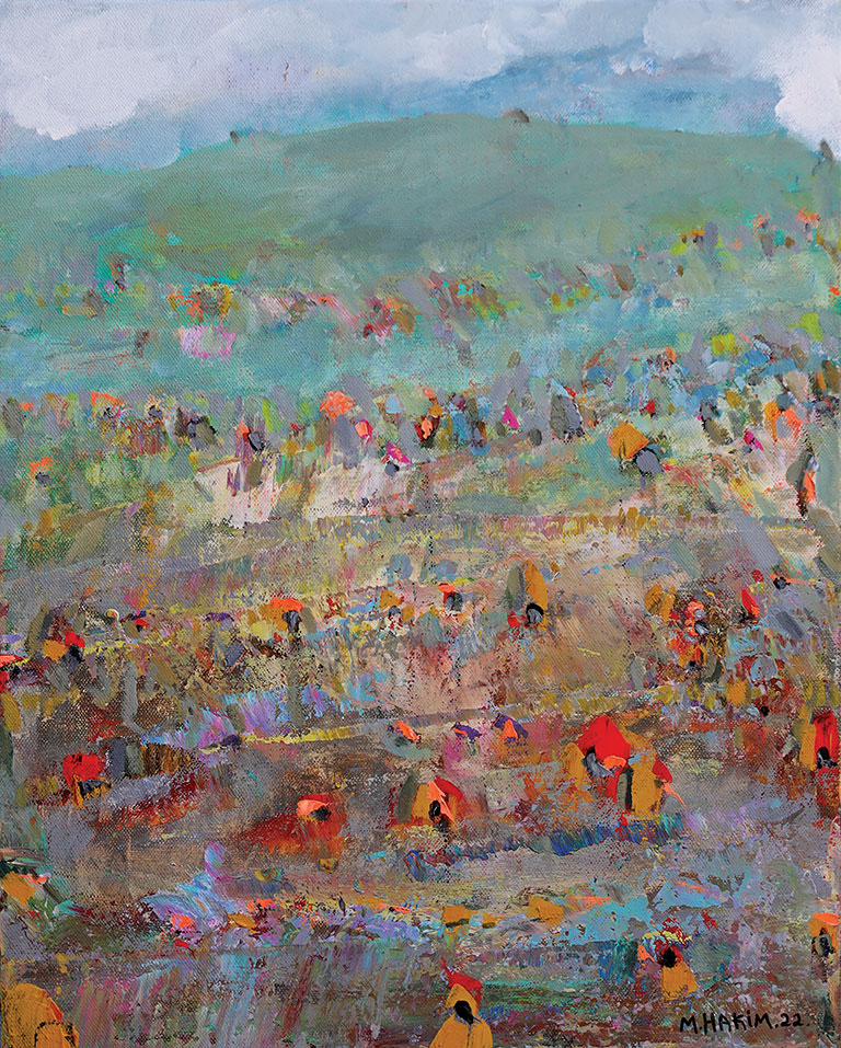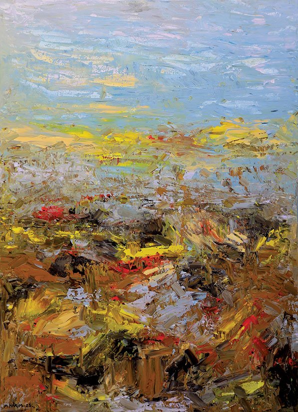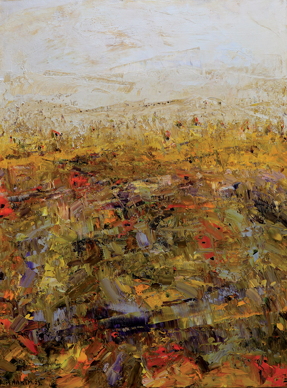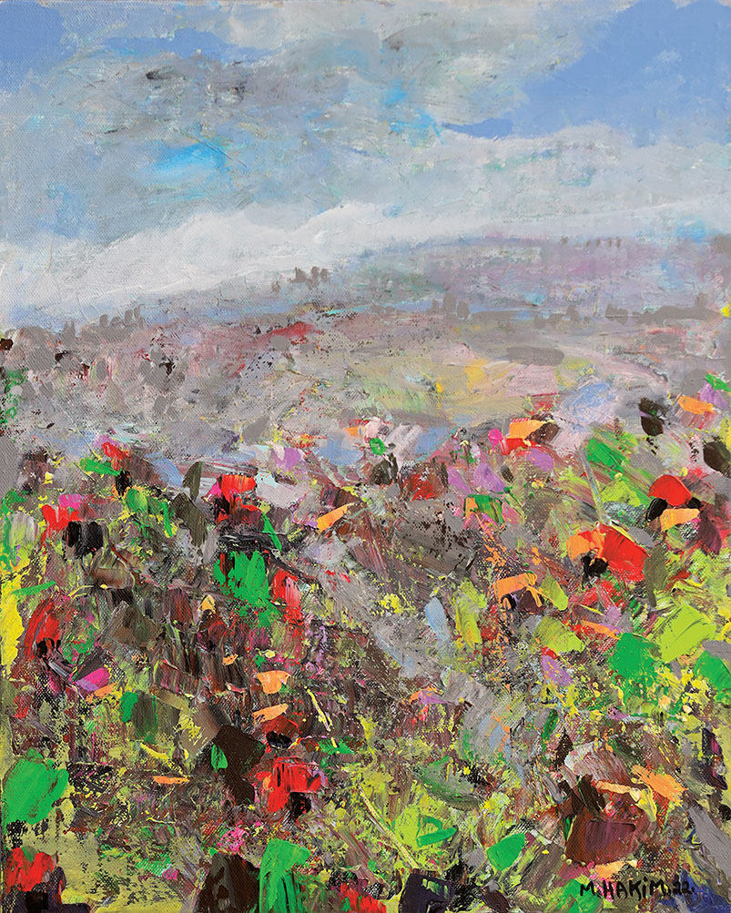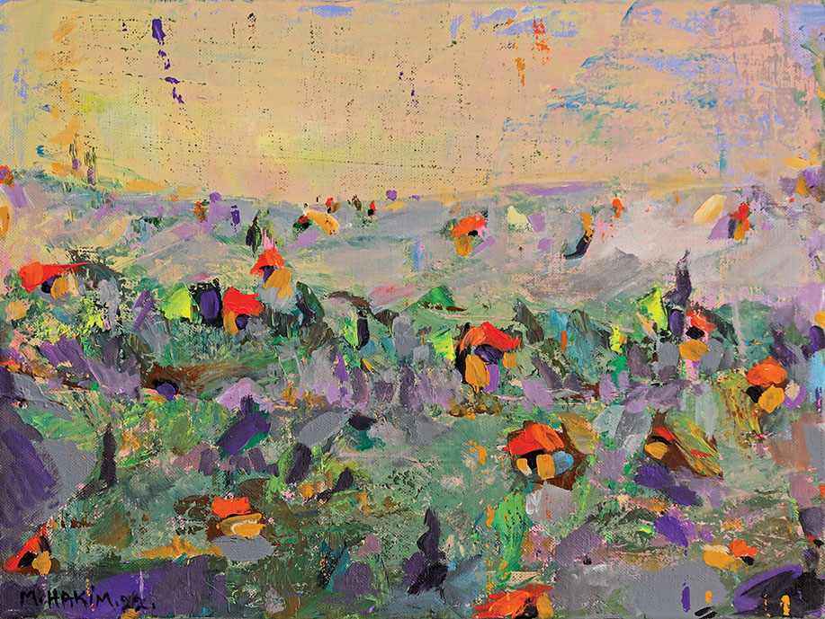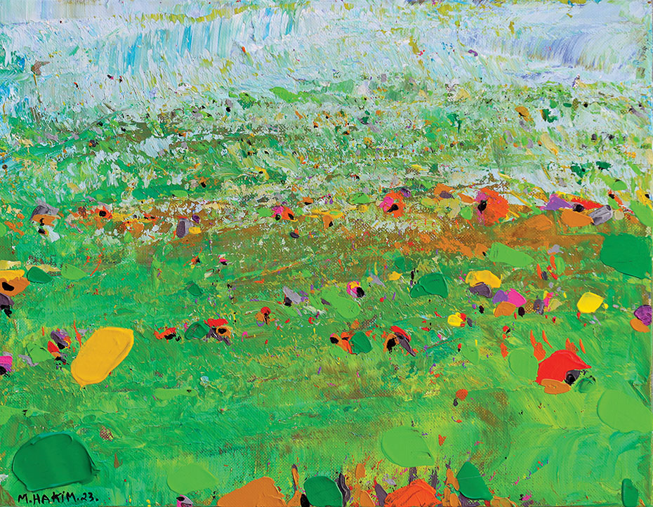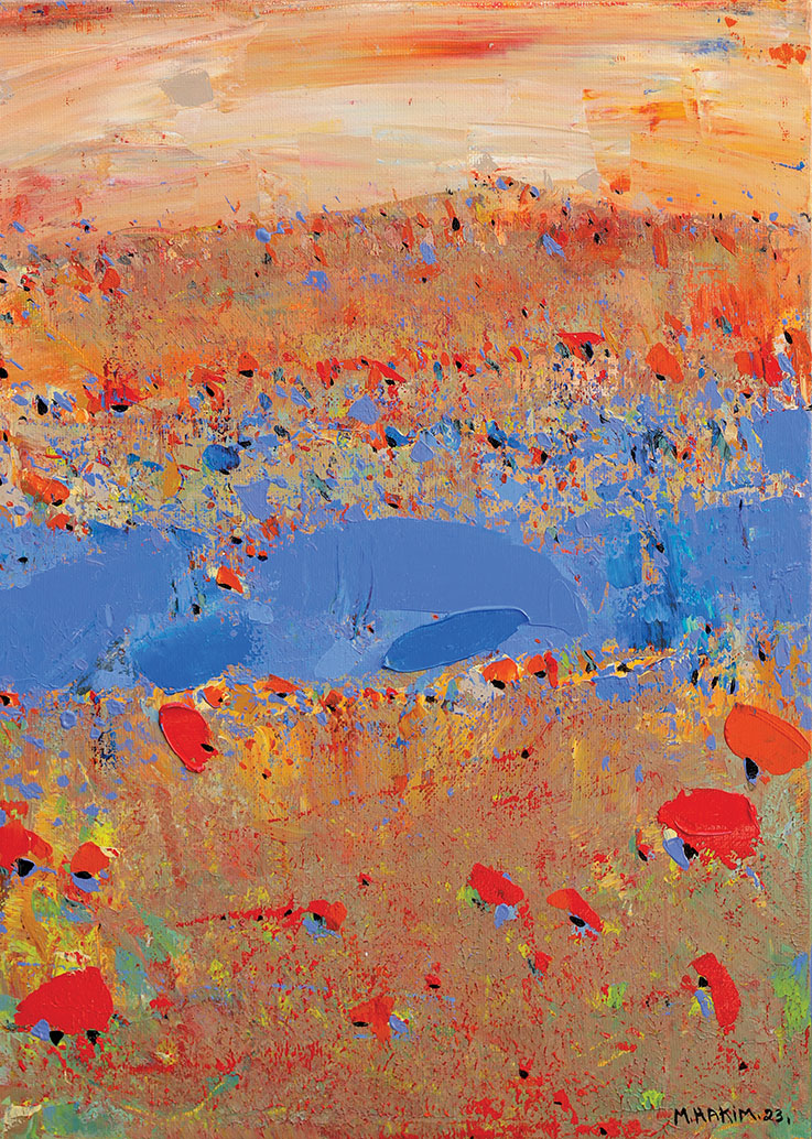 Maroun Hakim writes in introducing his new exhibition: “Luminous is the face of the earth, in its vibrations, its fertility and its interactions with light, water and soil. This dense identification with the beauties of nature does not prevent the interventions of my interior with current external events, and the anxious premonitions from which darkness and sadness emanate.”