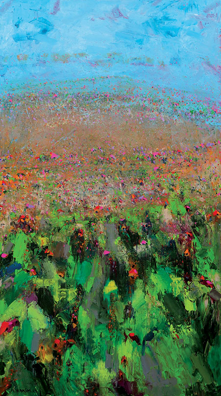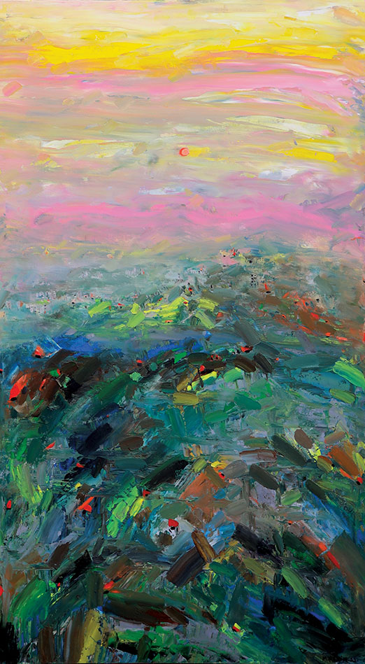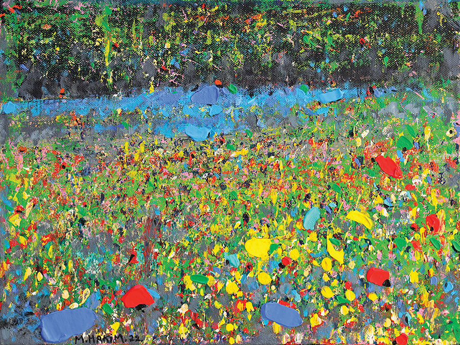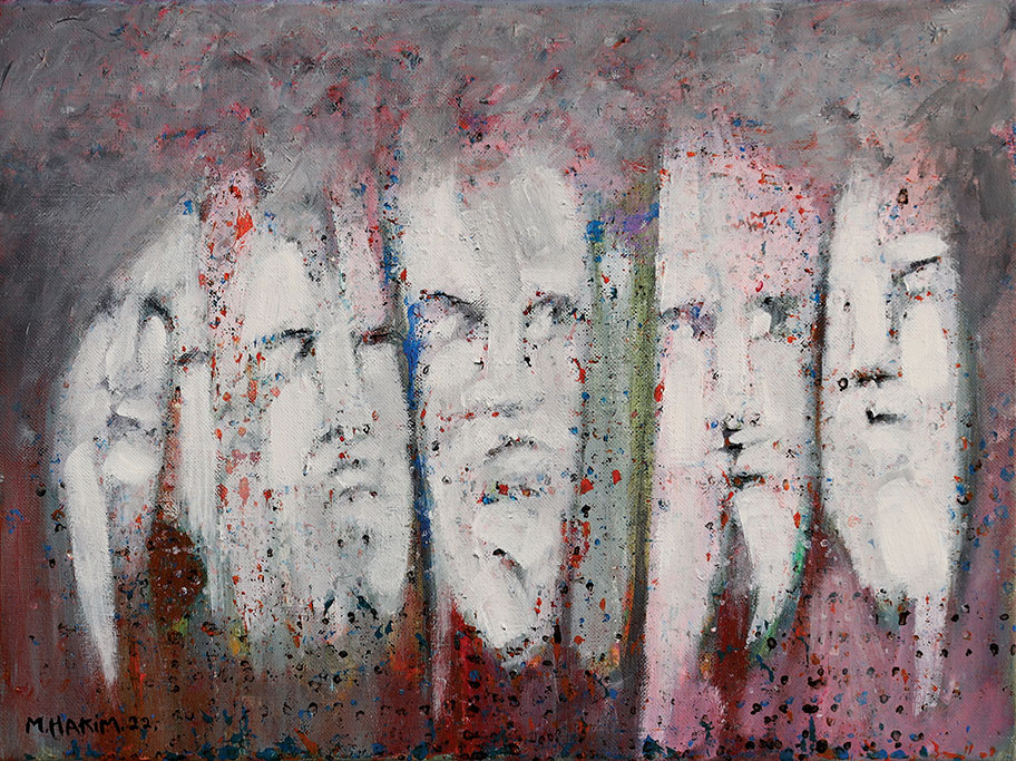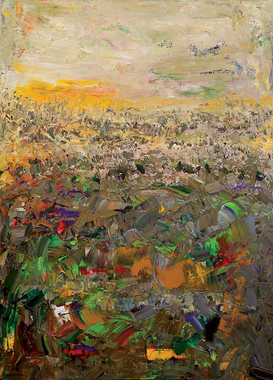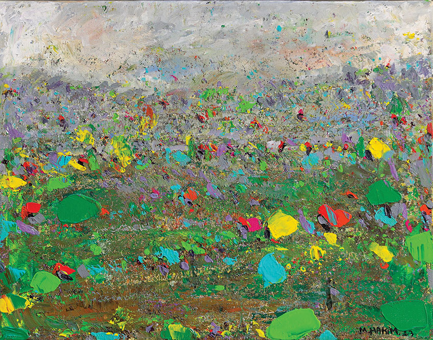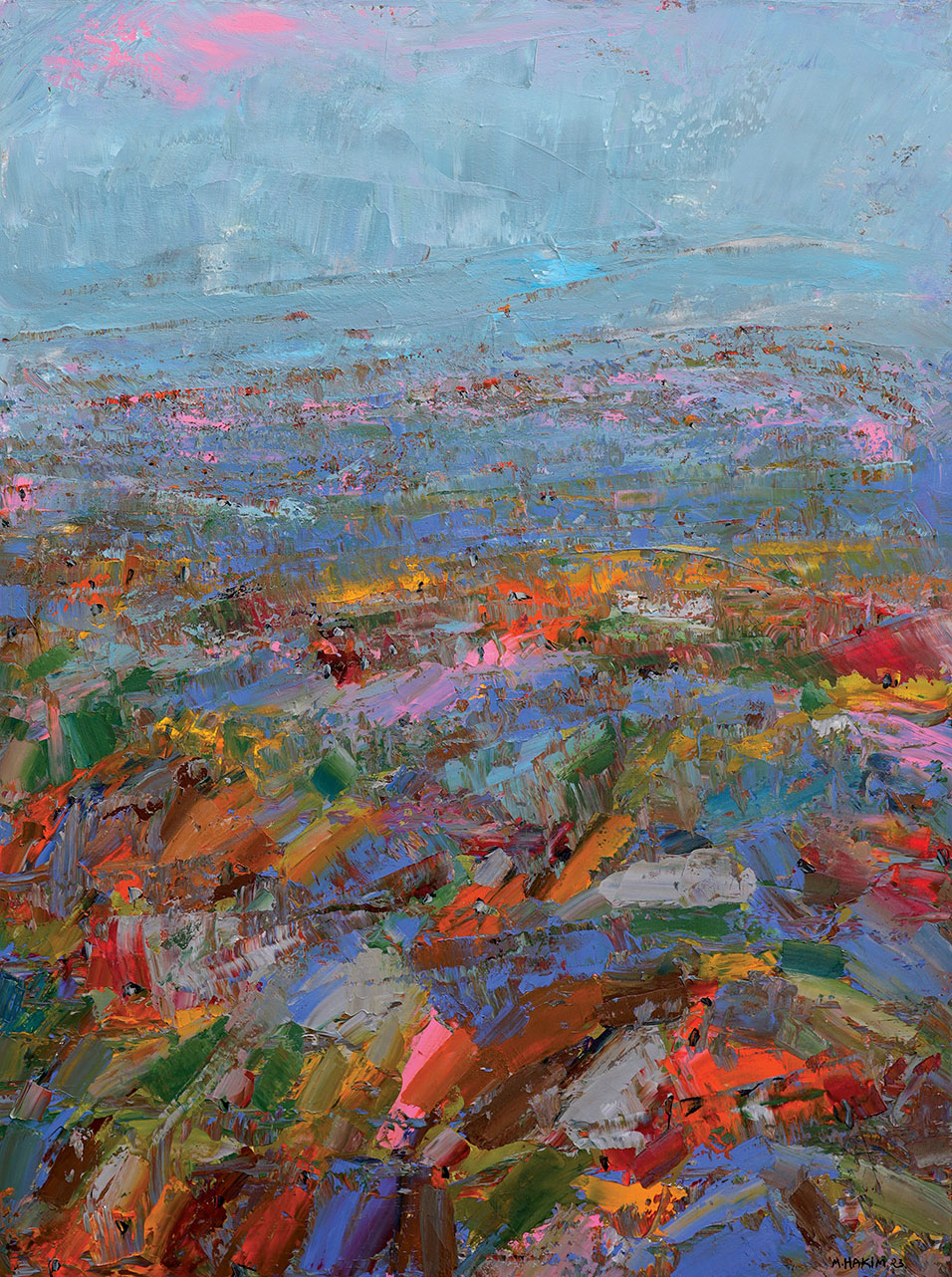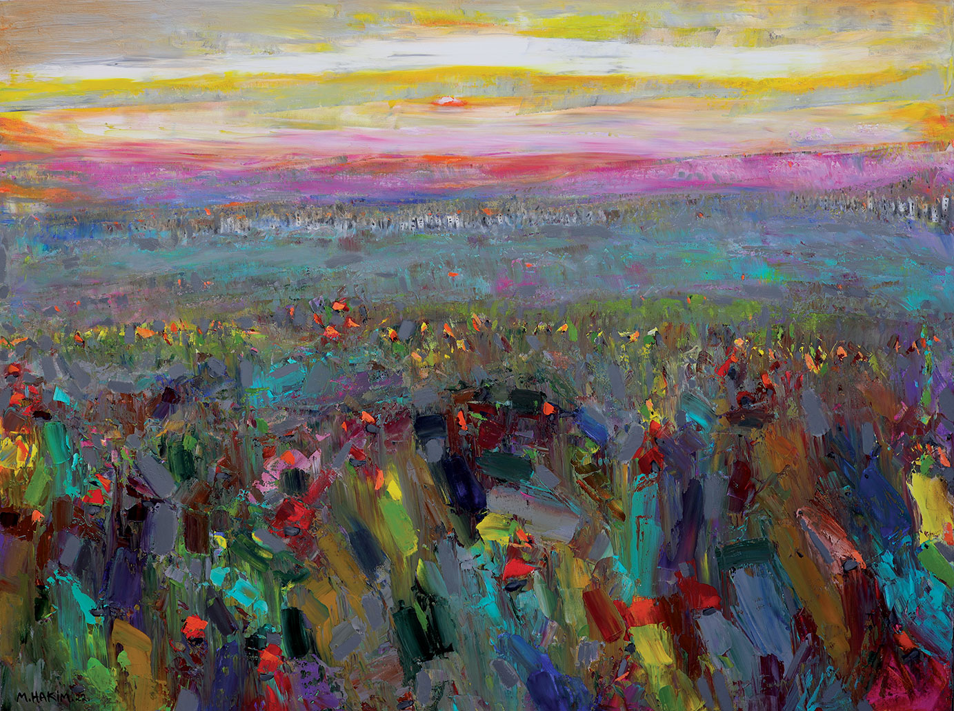 Maroun Hakim writes in introducing his new exhibition: “Luminous is the face of the earth, in its vibrations, its fertility and its interactions with light, water and soil. This dense identification with the beauties of nature does not prevent the interventions of my interior with current external events, and the anxious premonitions from which darkness and sadness emanate.”